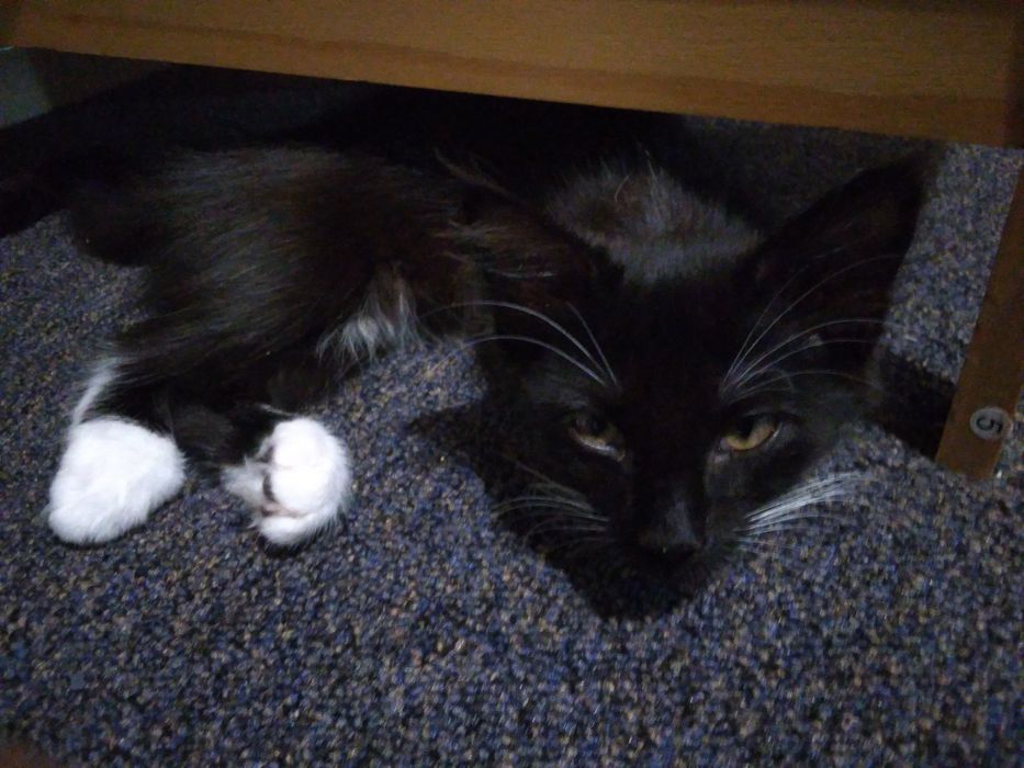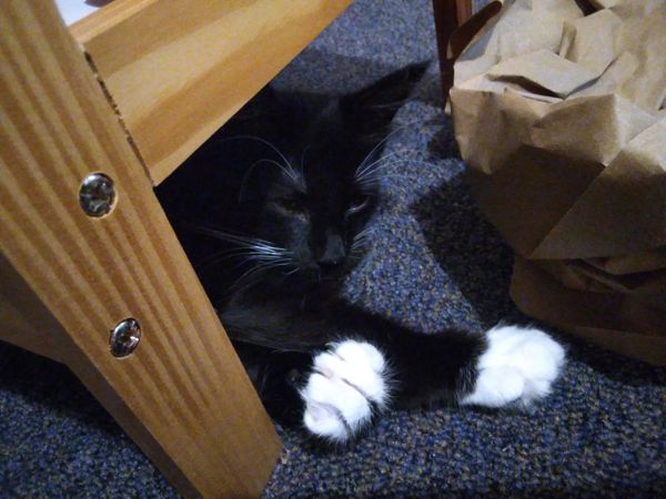 She's slowly getting used to me...She's still scared and unsure, but she wants to be near me anyway! So this is her compromise! =^∇^*=