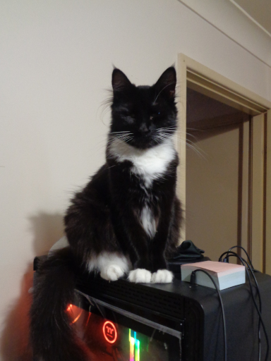 Pixie likes to sit on top of my computer now! It's very cute, but unfortunately the off switch is positioned right where her little paws go, so she keeps shutting my computer down by accident... (-_-;)・・・ So I put a stack of sticky notes on top of it lol.
